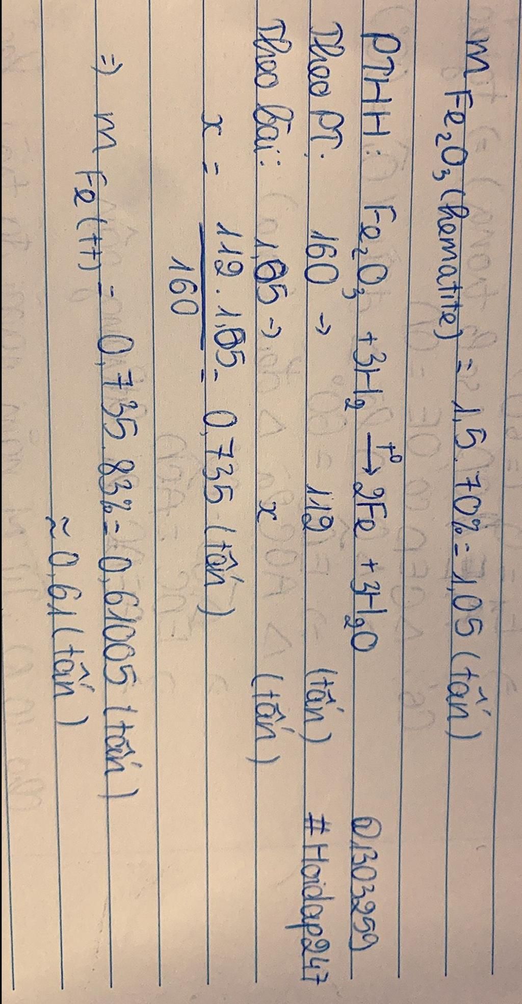Khử 1,5 tấn quặng hematite (thành phần chính là Fe2O3) chứa 30% tạp chất trơ bằng khí hydrogen ở nhiệt độ cao. Biết rằng hiệu suất phản ứng H = 83%. Tính số tấn Fe thu được từ quá trình tinh chế trên (Làm tròn kết quả đến hàng phần trăm).