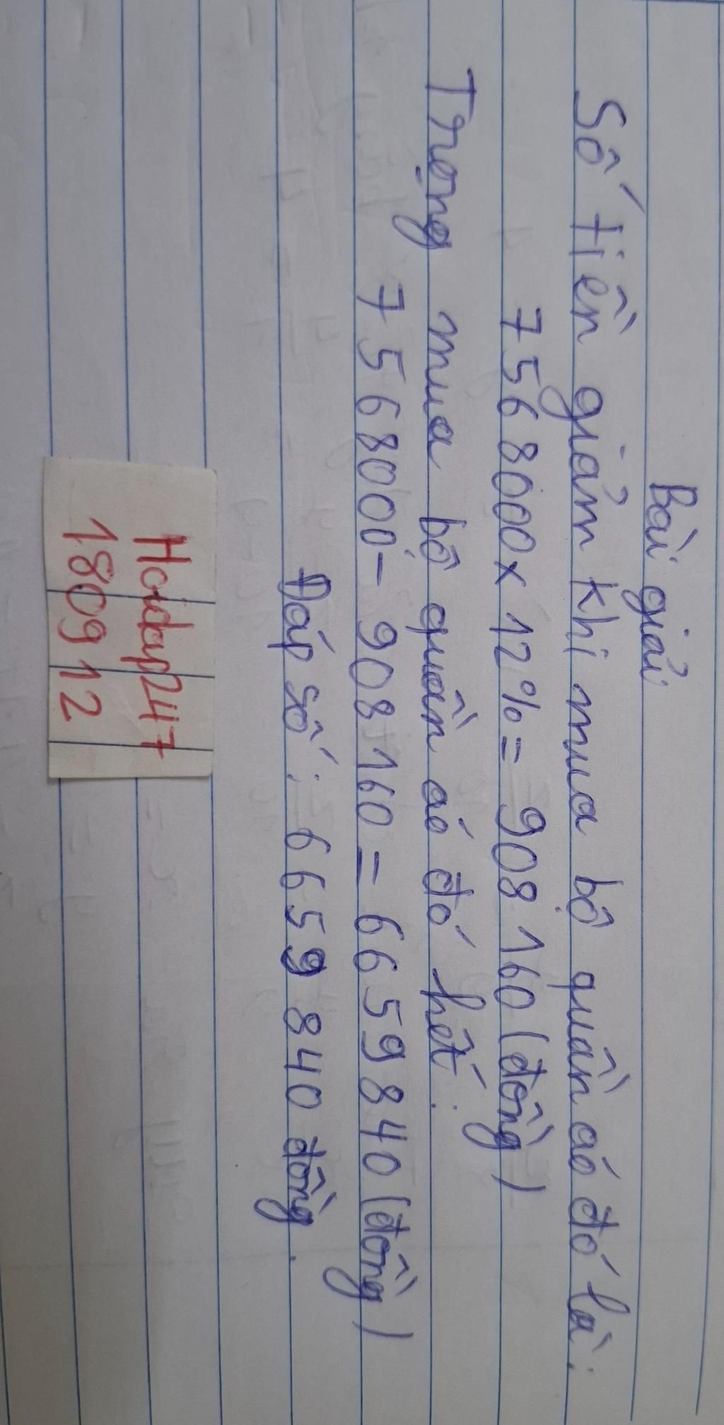 Bài 10: Trọng mua một bộ quần áo hàng hiệu có giá là 7568000 đồng, biết rằng cửa hàng đang có chương trình giảm giá 12% cho bộ quần áo đó. Như vậy Trọng mua bộ quần áo đó hết bao nhiêu tiền?