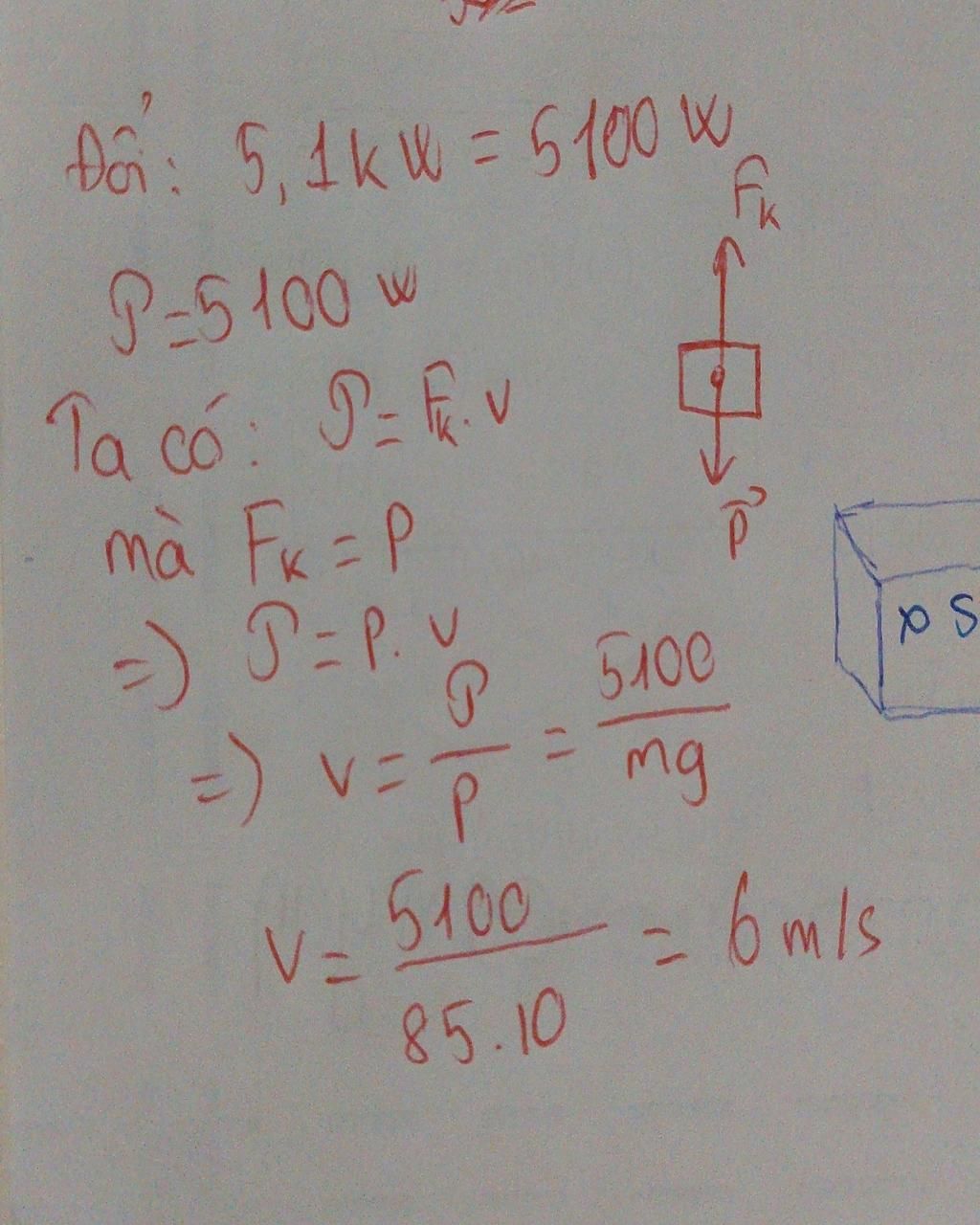 Trên công trường xây dựng, một người thợ sử dụng động cơ điện có công suất 5,1 kW để kéo một khối gạch nặng 85 kg lên cao. Giả thiết khối gạch chuyển động đều với tốc độ v. Lấy g=10 m/s2. Giá trị của v là