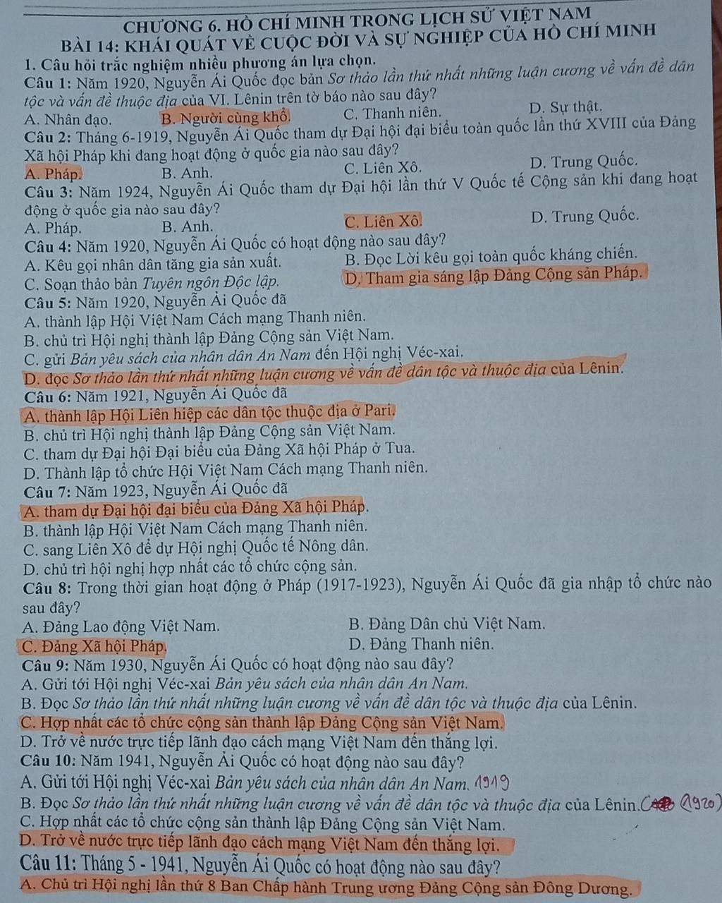 1. A → Năm 1920, Nguyễn Ái Quốc đọc bản Sơ thảo lần thứ nhất những luận cương về vấn đề dân tộc và vấn đề thuộc địa của Lênin trên báo Nhân đạo - cơ quan ngôn luận của Đảng Xã hội Pháp.