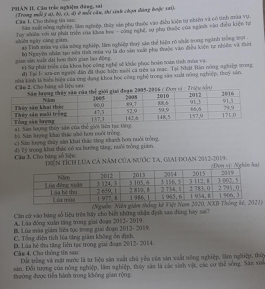b. Sai → Từ năm 2016, sản lượng nuôi trồng (79,9 triệu tấn) đã cao hơn sản lượng khai thác (91,1 triệu tấn) là sai. Thực tế, năm 2016 sản lượng khai thác vẫn cao hơn nuôi trồng (91,1 > 79,9).