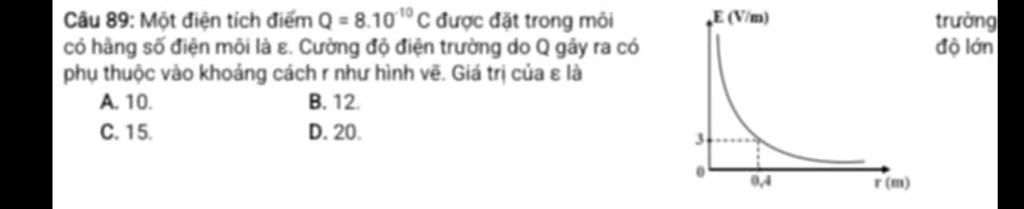 một điện tích điểm Q=8*10 mũ -10 được đặt trong môi trường có hằng số điện môi là ép si lon.cường độ điện trường do Q gây ra có độ lớn phụ thuộc vào khoảng cách r như hình vẽ. giá trị ép si lon là
