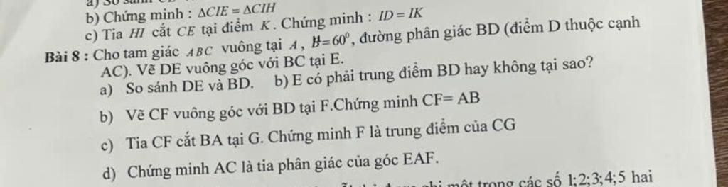 Bài 8 : Cho tam giác ABC vuông tại A, B=60°, đường phân giác BD (điểm D thuộc cạnh