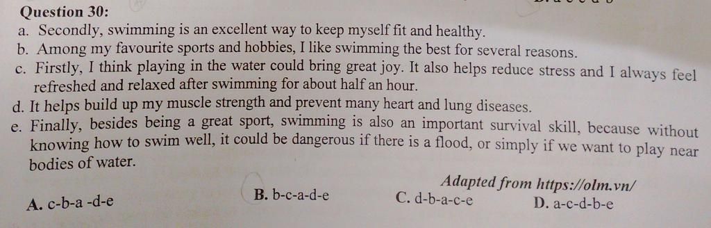 `→` a. Secondly, swimming is an excellent way to keep myself fit and healthy.