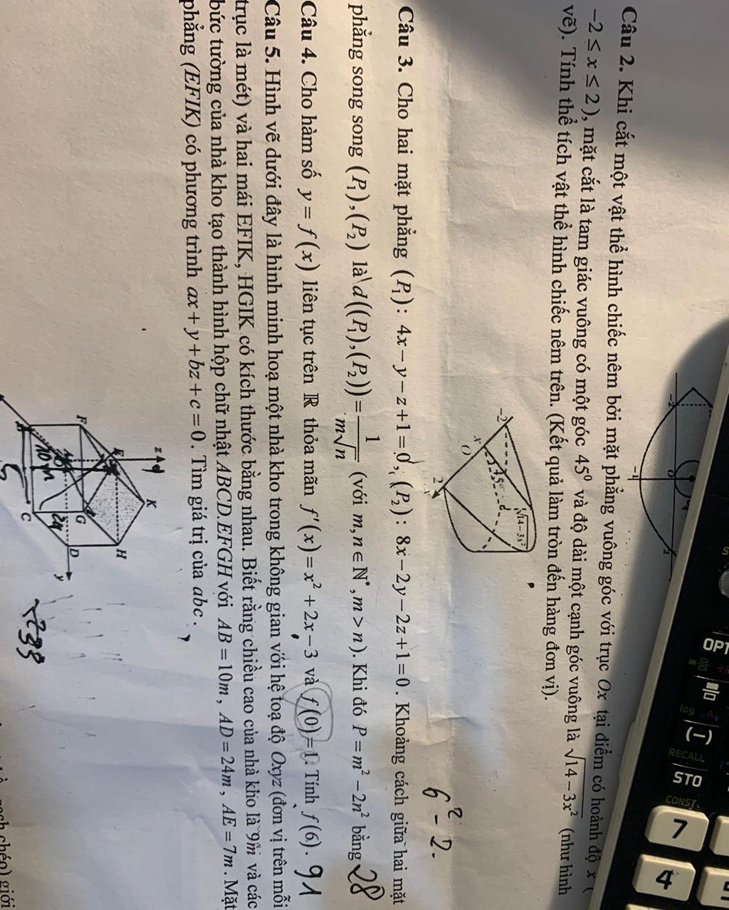 −2 ≤x≤2), mặt cắt là tam giác vuông có một góc 45° và độ dài một cạnh góc vuông là V14–3x (như hình