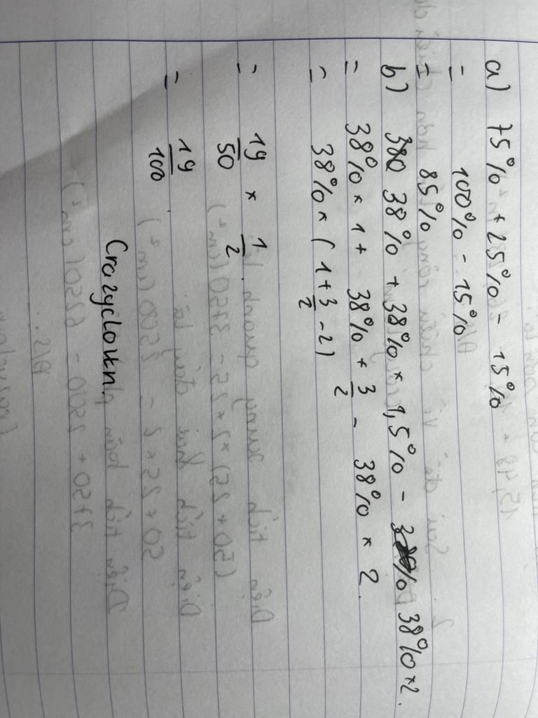 tính giá trị biểu thức sau a 75% + 25% - 15% b 38% + 38% x 1,5% - 38% x 2
