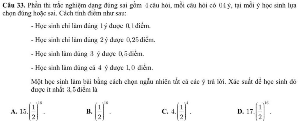 Vậy, xác suất để học sinh đó đạt được ít nhất 3,5 điểm là `(1/2)^16`