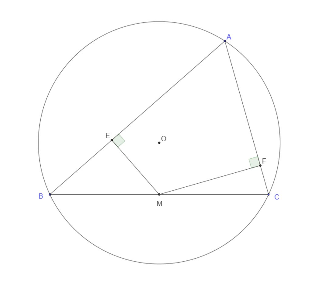 Cho tam giác ABC ( AB>AC ) nội tiếp đường tròn ( O ) . Gọi M là trung điểm của BC . Hai điểm E và F lần lượt là chắn đường vuông góc kẻ từ M đến AB , AC .