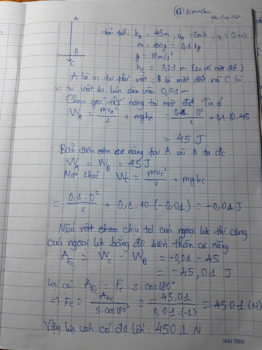 Một học sinh của trung tâm bồi dưỡng kiến thức Hà Nội đnag chơi đùa ở sân thượng trung tâm có độ cao 45m, liền cầm một vật có khối lượng 100g thả vật rơi tự do xuống đất. Lấy g=10m/s^2. Khi chạm đất do đất mềm nên vật bị lún sâu 1 cm. Lực cản trung bình tác dụng lên vật bằng bao nhiêu N?