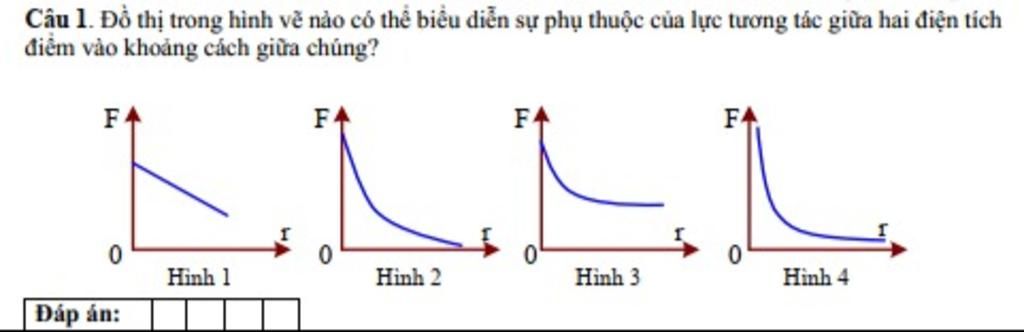 Lực tương tác giữa hai điện tích điểm tỉ lệ nghịch với bình phương khoảng cách giữa chúng. Đồ thị biểu diễn mối quan hệ này là đồ thị hàm số nghịch đảo bình phương. Hình 4 thể hiện điều này.