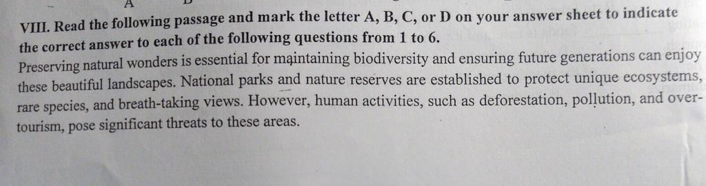 `->` Bài đọc nhấn mạnh về bảo tồn thiên nhiên, không phải du lịch hay ô nhiễm