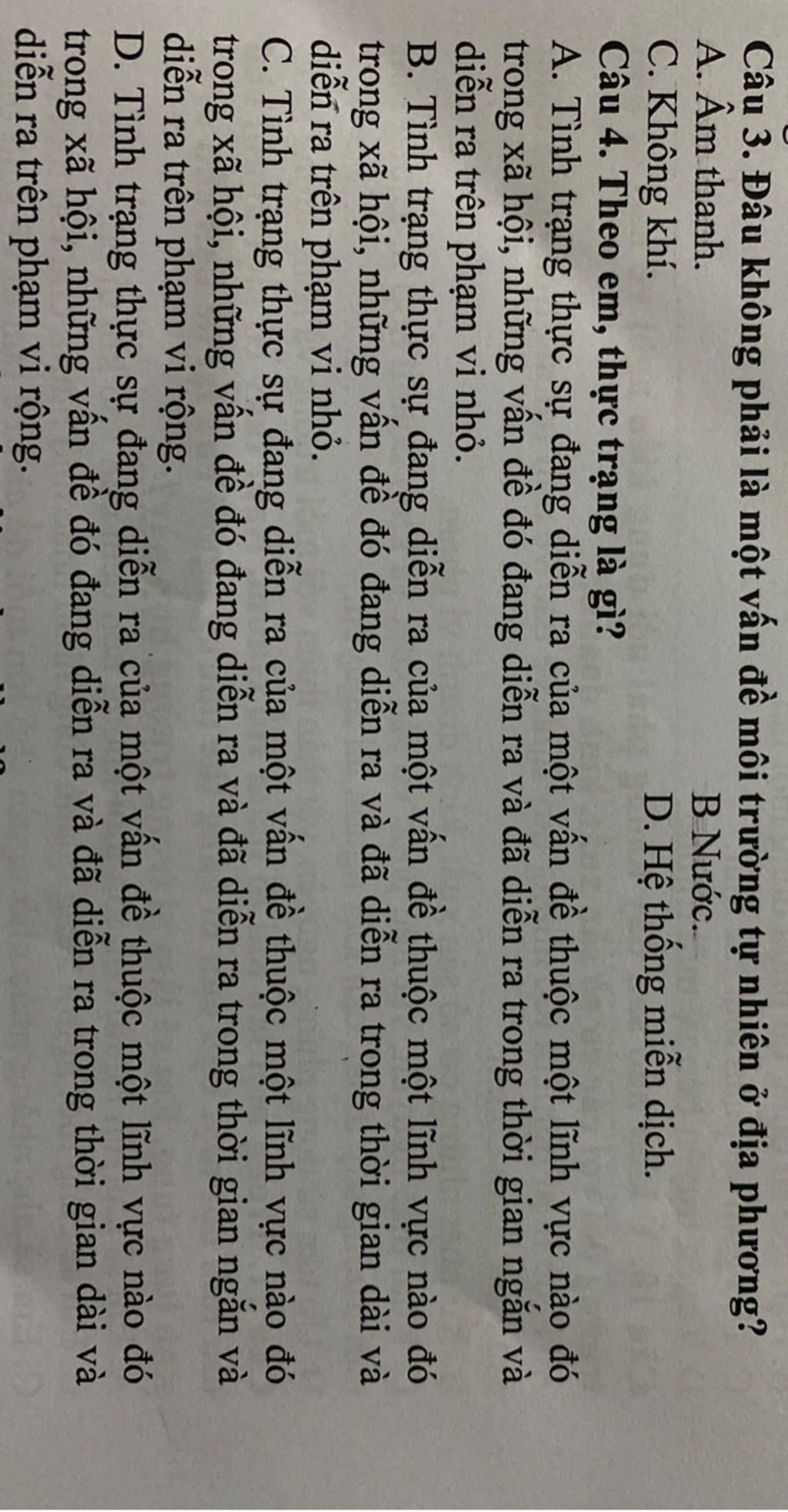 Giải thích: Các vấn đề về môi trường tự nhiên bao gồm ô nhiễm nước, không khí, ô nhiễm tiếng ồn. Hệ thống miễn dịch thuộc về sinh học và y học, không phải là một vấn đề môi trường tự nhiên.