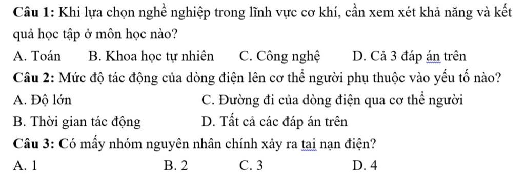 Câu 1: Khi lựa chọn nghề nghiệp trong lĩnh vực cơ khí, cần xem xét khả năng và kết