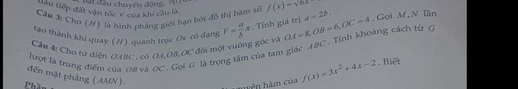 Câu 4: Cho tứ diện OABC có OI,OB,DC đôi một vuông góc và O4=8, OB=6. OC ...