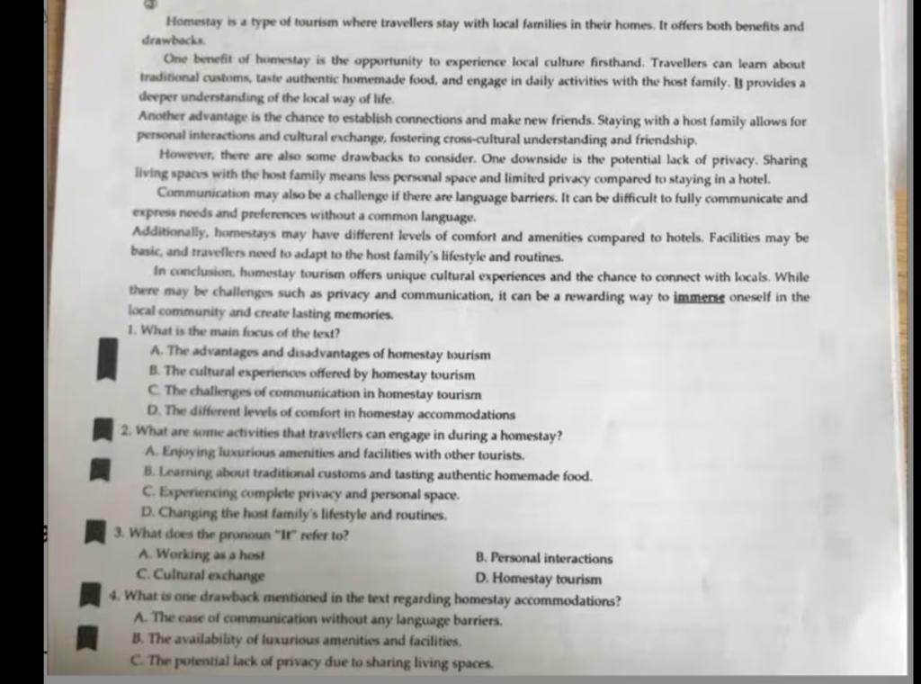 → Bài đọc trình bày cả lợi ích và hạn chế của homestay, nên đáp án đúng là A.