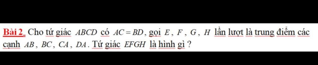 Ta có: $E, F, G, H$ là trung điểm $AB, BC, CD, dA$