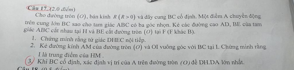Cho đường tròn (O), bán kính R (R>0) và dây cung BC cố định. Một điểm A chuyển động