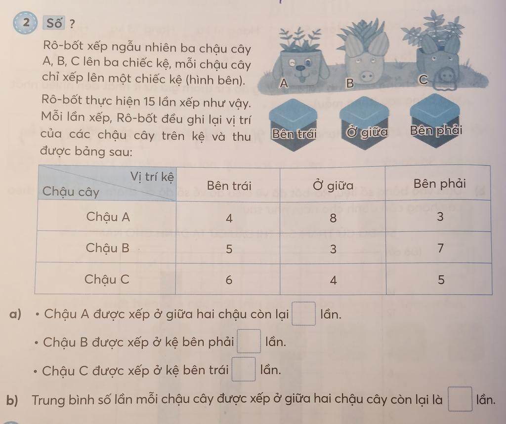b. Trung bình số lần mỗi chậu này được xếp ở giữa hai chậu cây còn lại 5 lần