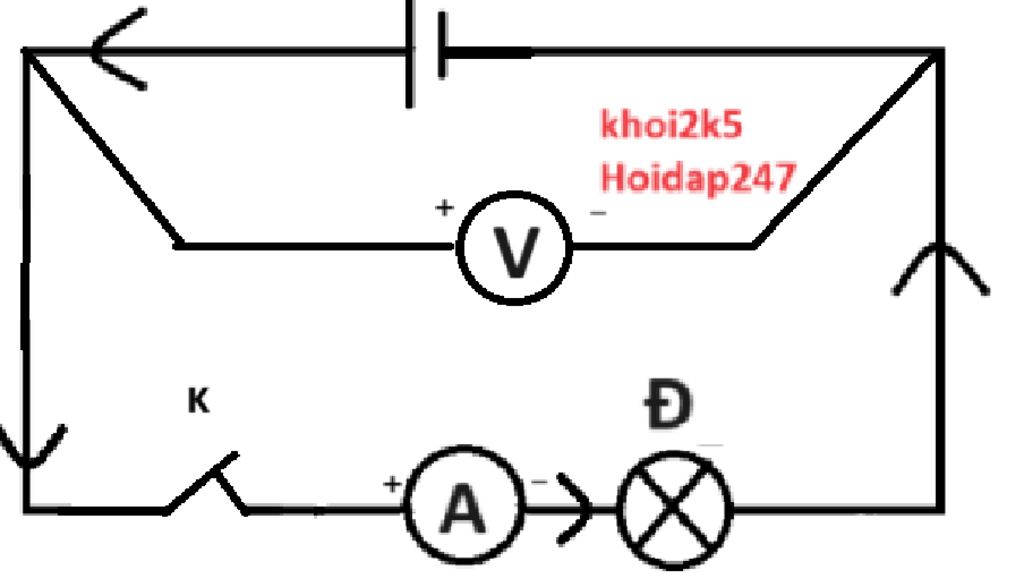 Cho các thiết bị điện sau: Nguồn 1 pin,1 đèn, 1 ampe kế, 1 vôn kế đi hiệu điện thế giữa 2 cực nguồn điện, 1 khoá K