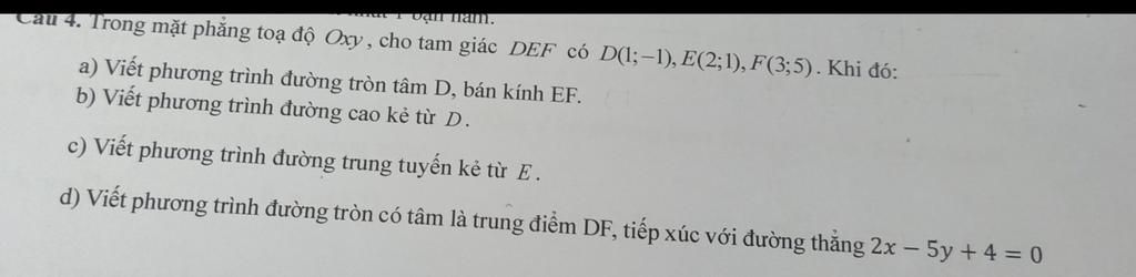 a) Viết phương trình đường tròn tâm D, bán kính EF.