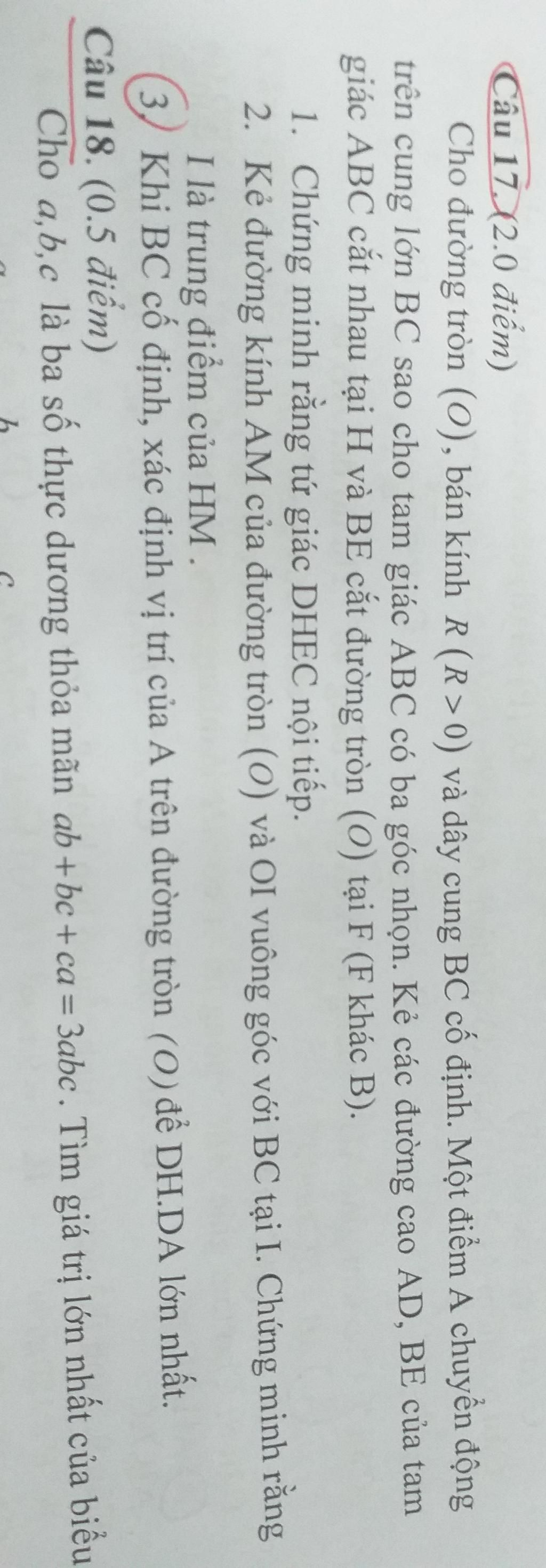 Cho đường tròn (O), bán kính R (R>0) và dây cung BC cố định. Một điểm A chuyển động