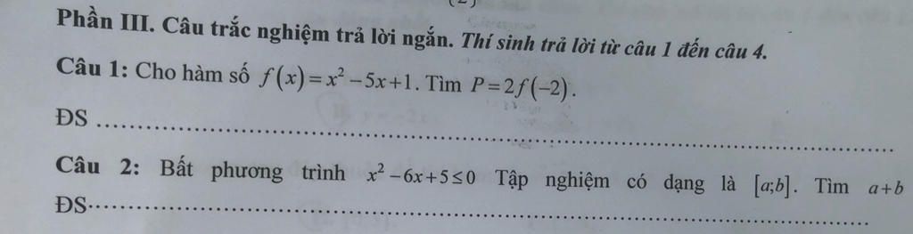Câu 2: Bất phương trình x-6x+5≤0 Tập nghiệm có dạng là [ab]. Tìm a+b