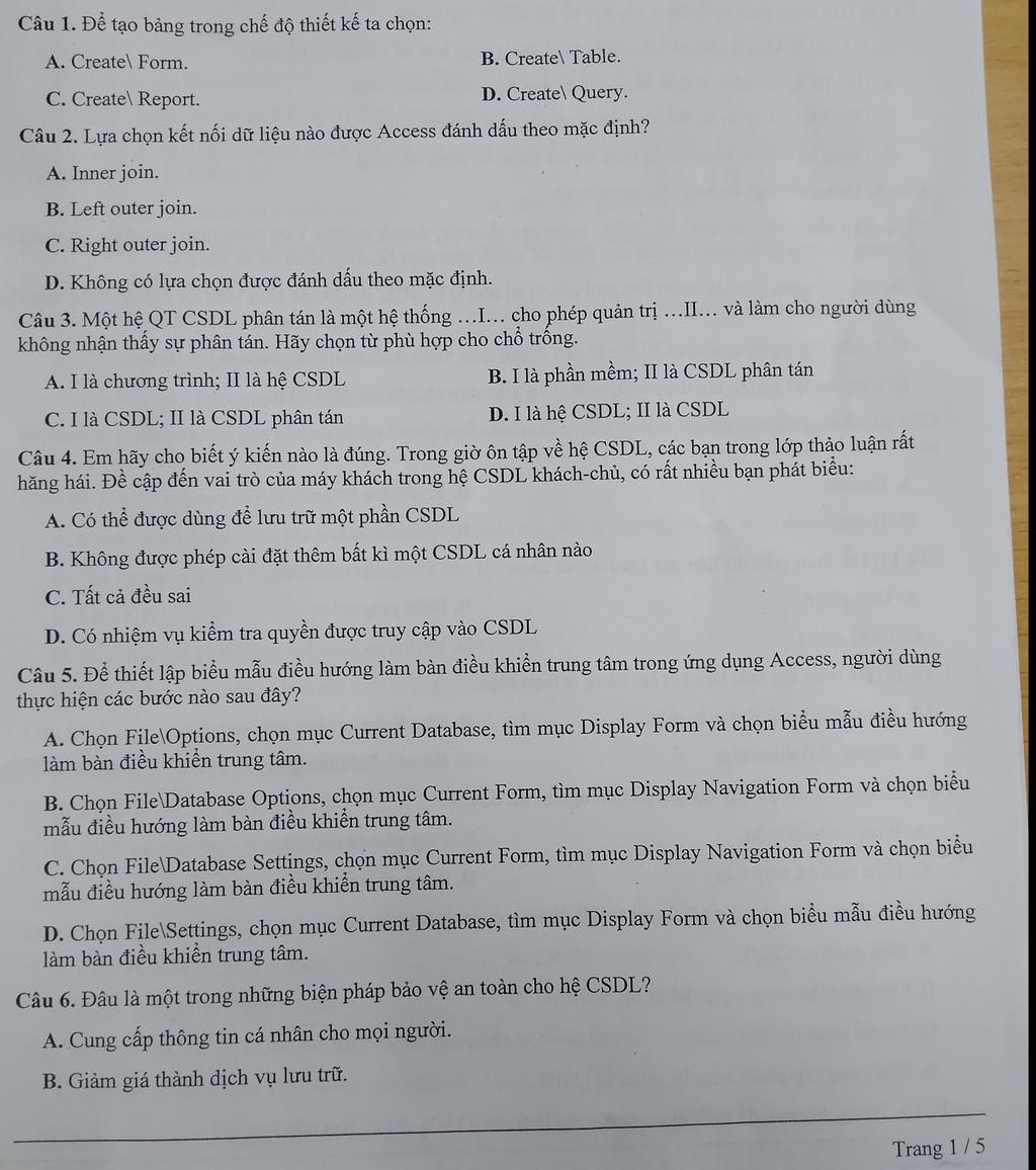 Câu 1. Để tạo bảng trong chế độ thiết kế ta chọn: