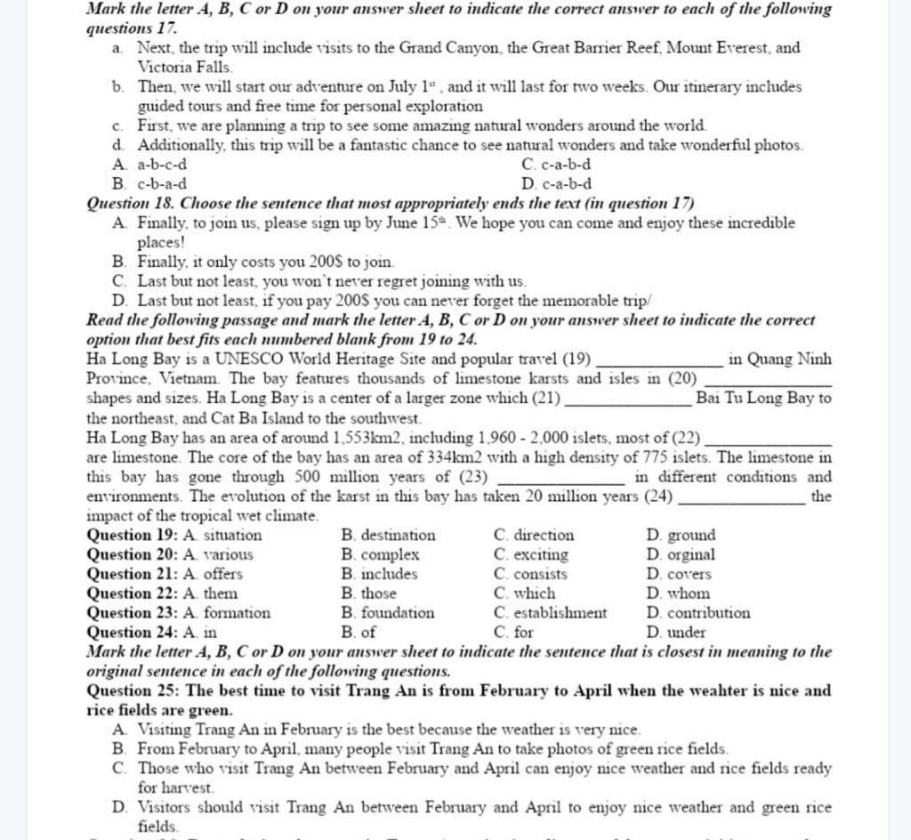 Mark the letter A, B, C or D on your answer sheet to indicate the correct answer to each of the following