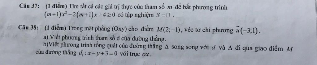 Câu 38: (1 điểm) Trong mặt phẳng (Oxy) cho điểm M(2;−1), véc tơ chỉ phương ū(-3;1).