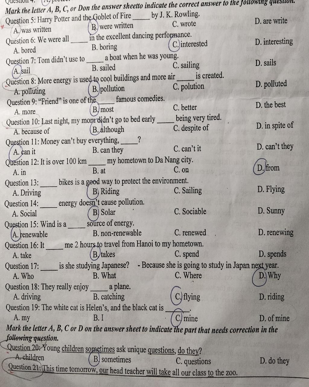 Làm lại hộ mình những câu bị khoảnh tròn vs ạ(question 5,8,10,20,21)