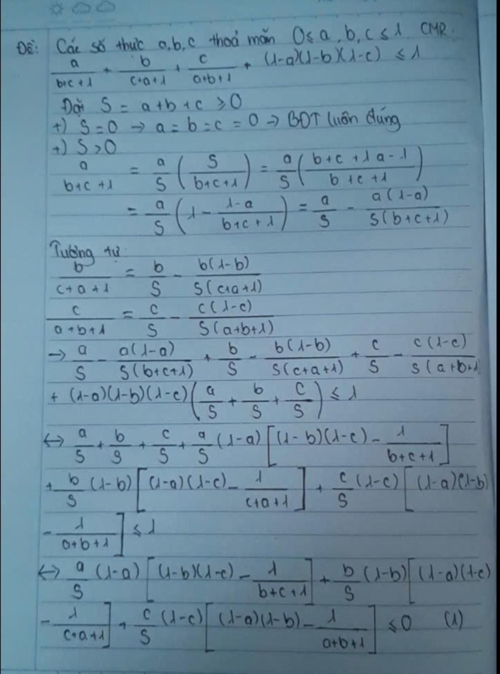 `a/(b+c+1)+b/(c+a+1)+c/(a+b+1)+(1-a)(1-b)(1-c)<=1`
