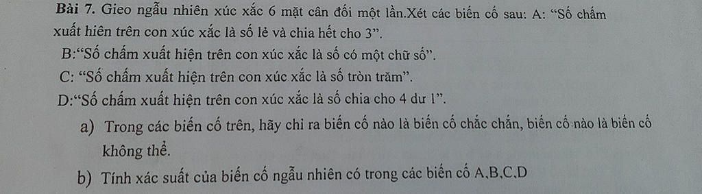 Bài 7. Gieo ngẫu nhiên xúc xắc 6 mặt cân đối một lần.Xét các biến cố sau: A: “Số chấm