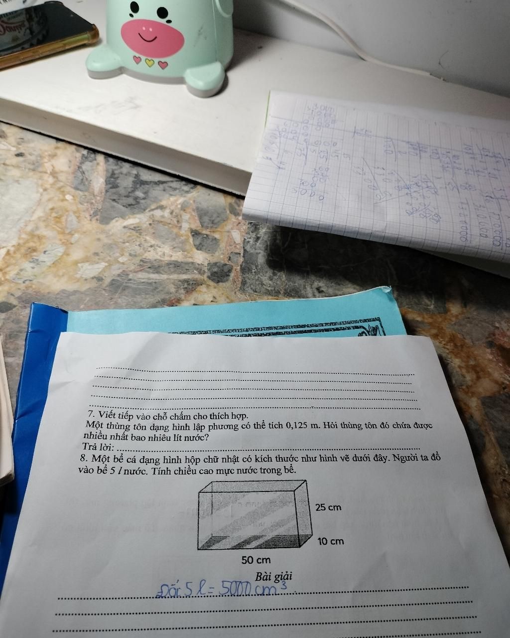 Đổi: `5` lít = `5000` cm³