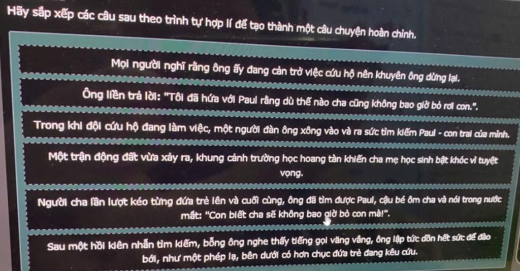 5)Sau một hồi kiên nhẫn tìm kiếm,bỗng ông nghe thấy tiếng gọi văng vẳng,ông lập tức dồn hết sức để đào bới, như một phép lạ, bên dưới có hơn chục đứa trẻ đang kêu cứu.