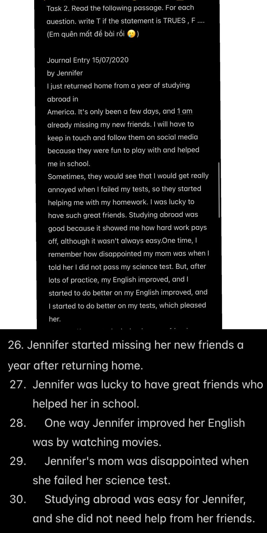 `->` Jennifer thấy việc du học không dễ dàng và cô cần sự giúp đỡ từ bạn bè.