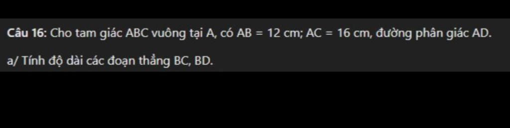 Câu 16: Cho tam giác ABC vuông tại A, có AB = 12 cm; AC = 16 cm, đường phân giác AD.