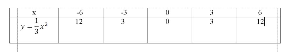 $\begin{array}{|c|c|c|c|c|c|}\hline\text{x}&\text{-6}&\text{-3}&\text{0}&\text{3}&\text{6}\\\hline\text{y=1/3 x^2}&\text{12}&\text{3}&\text{0}&\text{3}&\text{12}$
