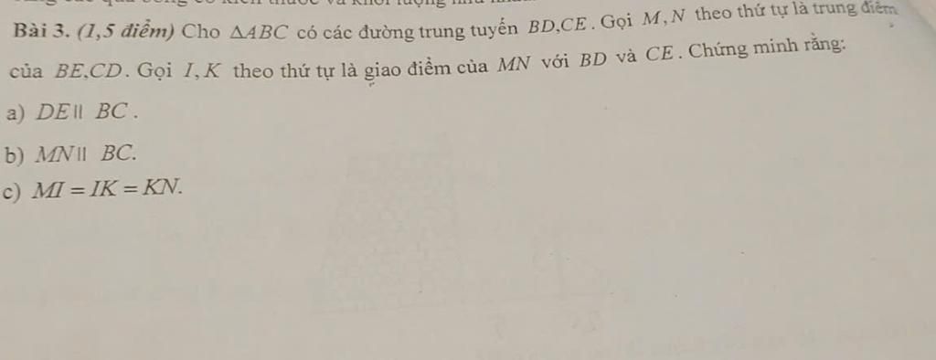 Bài 3. (1,5 điểm) Cho A4BC có các đường trung tuyển BD,CE. Gọi M,N theo thứ tự là trung điểm