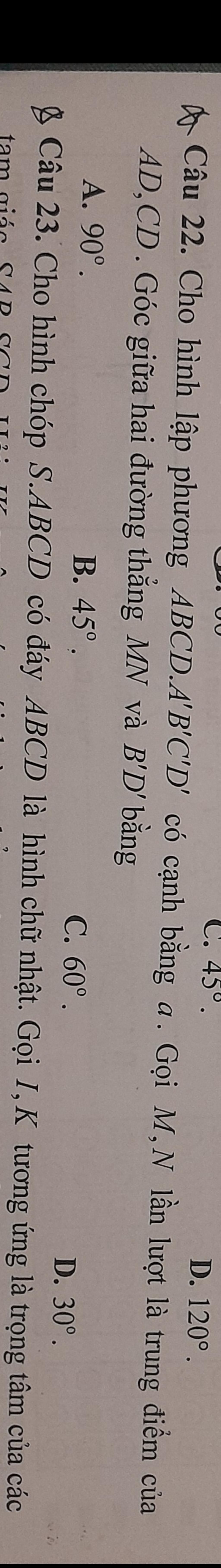 - Câu 22. Cho hình lập phương ABCD.A'B'C'D' có cạnh bằng a. Gọi M,N lần lượt là trung điểm của