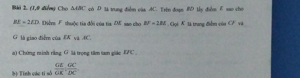 Bài 2. (1,0 điểm) Cho ABC có D là trung điểm của AC. Trên đoạn BD lấy điểm E sao cho