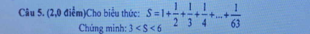 Ta lại có: `S = 1 + 1/2 + 1/3 + 1/4 + 1/5 + 1/6 + 1/7 + (1/8 + ... + 1/15) + (1/16 + ... + 1/31) + (1/32 + ... + 1/63)`