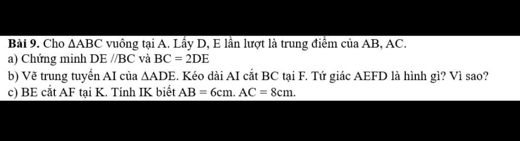 c) BE cắt AF tại K. Tính IK biết AB = 6cm. AC = 8cm.