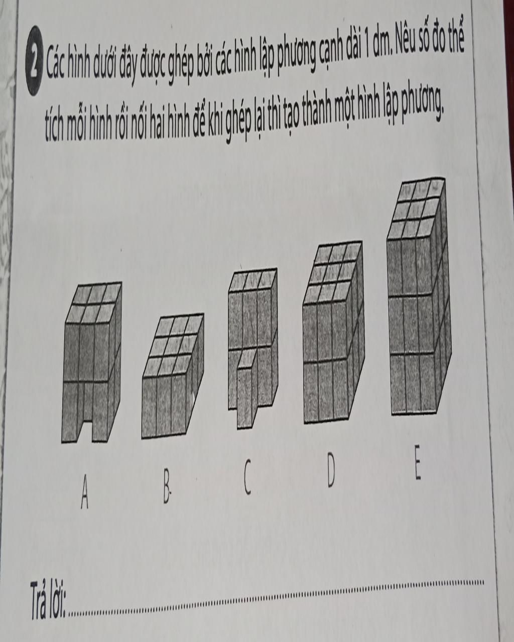 Các hình trên được ghép bởi hình lập phương dài 1 dm nêu số đo thể tích mỗi hình đồi nối hai hình để khi ghép lại tạo thành một hình lập phương