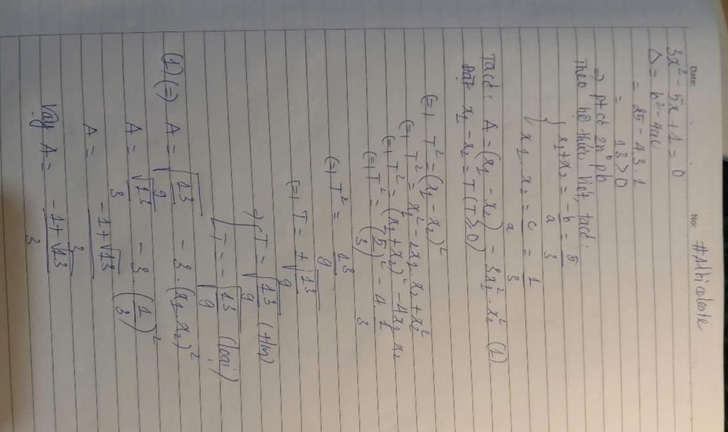 Cho phương trình `3``x^{2}``-5x+1=0`. Gọi `x_{1}``;``x_{2}` là hai nghiệm của phương trình trên. Không giải phương trình, hãy tính giá trị của biểu thức `A=(``x_{1}``-``x_{2}``)-3``x_{1}^{2}``x_{2}^{2}`