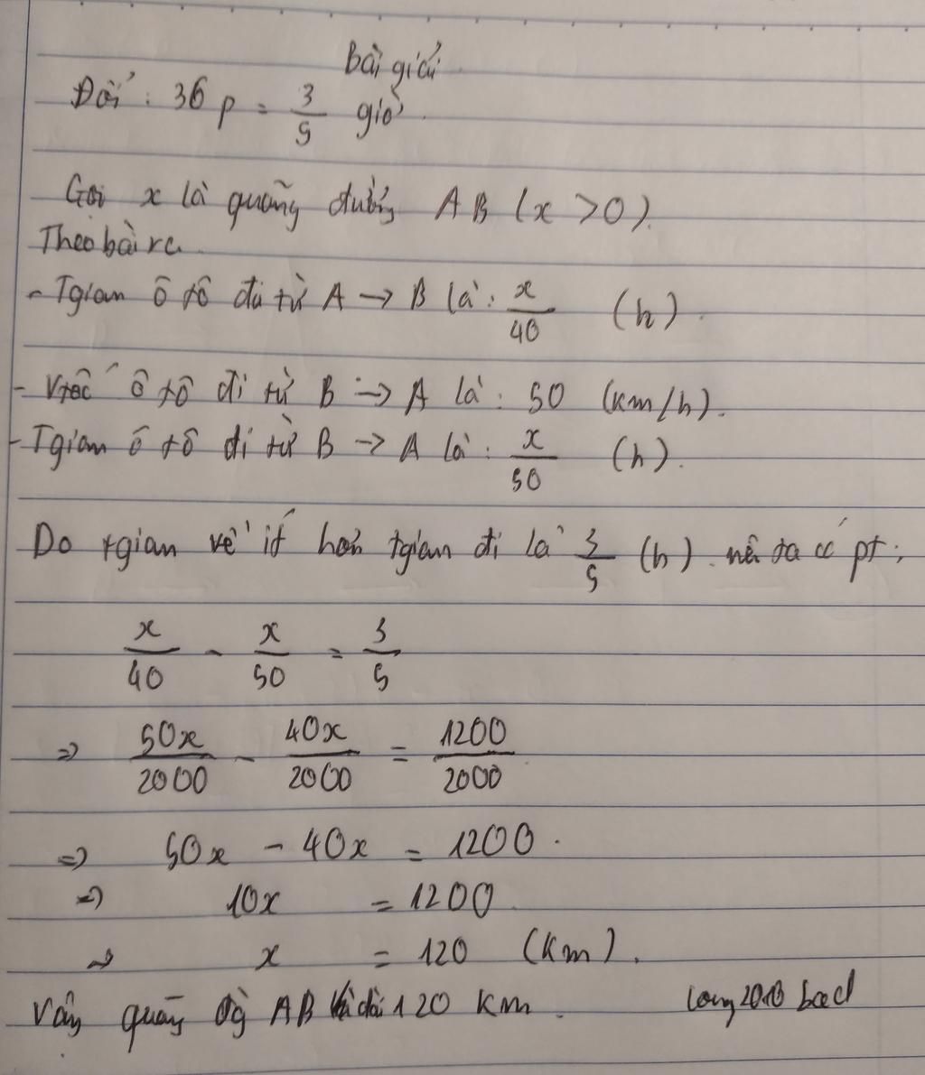 Một ô tô đi từ A đến B với vận tốc 40 km/h, khi đi từ B về A ô tô tăng tốc thêm 10 km/h nên thời gian về ít hơn thời gian đi là 36p, tính quãng đường AB