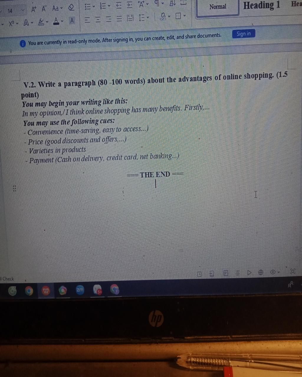 Online shopping is becoming more and more popular because of its benefits. Firstly, buying something via the internet is convenient. You can stay at home and buy whatever you need. You don't have to travel to any shops to buy. You also don't have to wait for purchasing. So that, you can save money and time. Secondly, you can buy cheaper items than shopping offline. There are many different shops and you can compare the prices and decide which shops you want. In conclusion, online shopping is very convenient for us