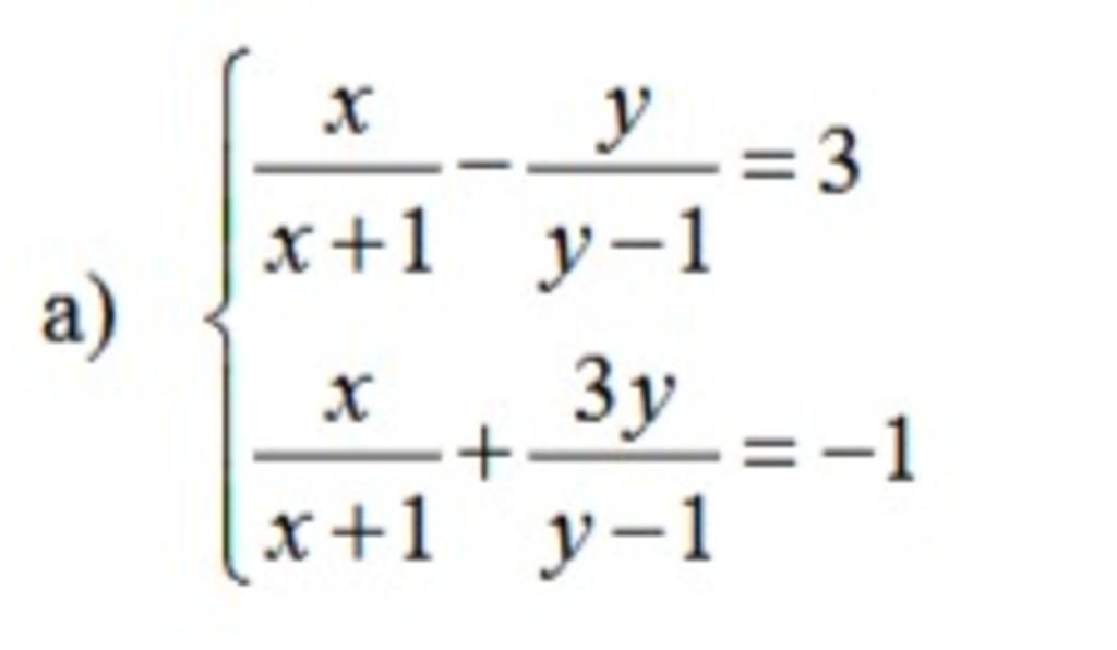 `=> {(y/(y - 1) = -1),(x/(x+ 1) = 2):}`