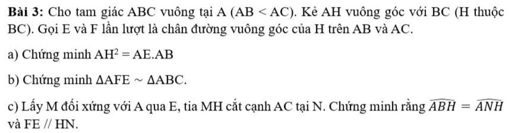 Bài 3: Cho tam giác ABC vuông tại A (AB < AC). Kẻ AH vuông góc với BC (H thuộc