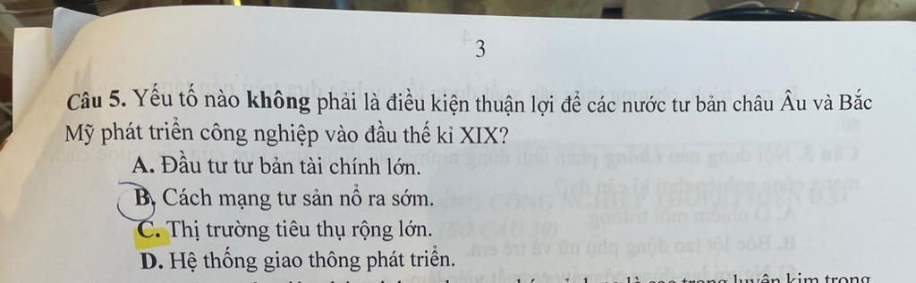 Giải thích: Các cuộc cách mạng tư sản (như Cách mạng Tư sản Anh, Cách mạng Mỹ, Cách mạng Pháp) có vai trò thúc đẩy sự phát triển của chủ nghĩa tư bản nhưng bản thân việc nổ ra sớm hay muộn không phải là yếu tố quyết định trực tiếp đến sự phát triển công nghiệp vào đầu thế kỷ XIX.