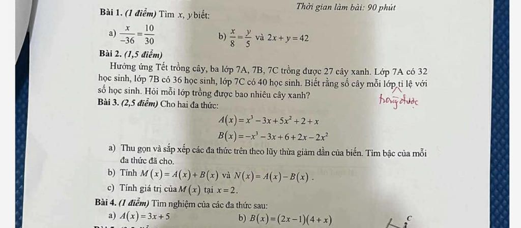 học sinh, lớp 7B có 36 học sinh, lớp 7C có 40 học sinh. Biết rằng số cây mỗi lớp tỉ lệ với